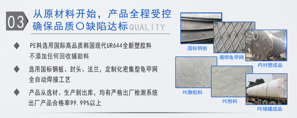 公司有鋼襯塑PE/PO、PE全塑、碳鋼、不銹鋼四大系列100多個品種,專注于常壓儲存容器生產(chǎn),其產(chǎn)品包括鋼襯塑儲罐、管口一體成型PE儲罐、碳鋼儲罐、不銹鋼儲罐、反應(yīng)釜、攪拌罐、離子交換柱、鋼襯PE/PO儲罐塑料儲罐、鹽酸儲罐、硫酸儲罐等等。更大限度滿足廣大客戶的各種需求,同時可以根據(jù)客戶的需要加工定制各種防腐設(shè)備。